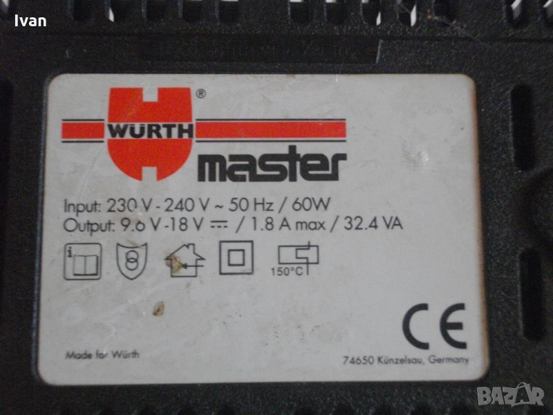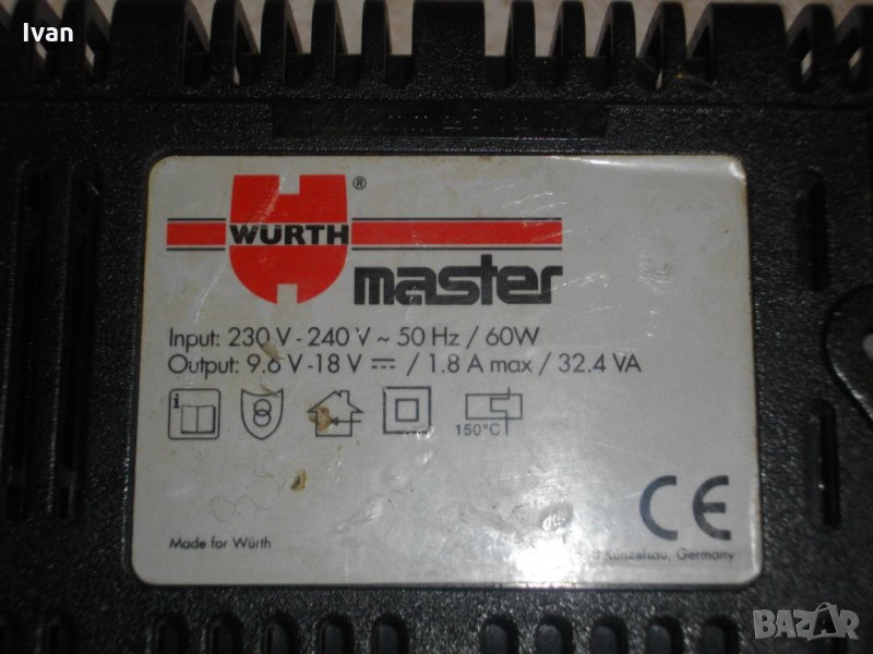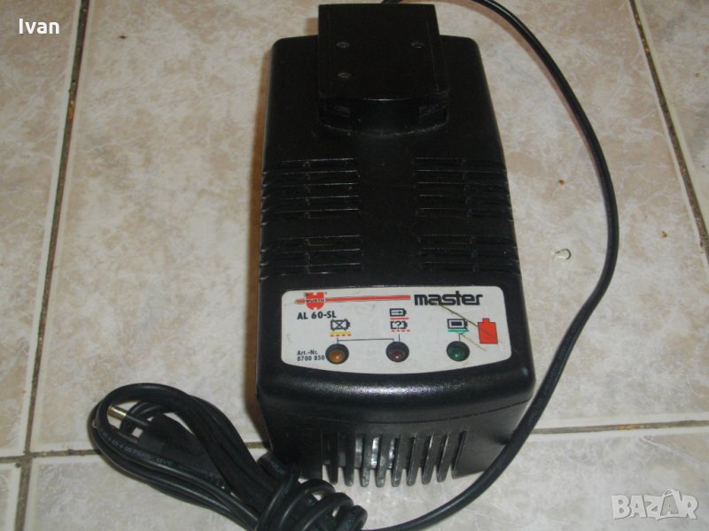 Wurth Master AL60-SL.Голямо,масивно,тежко,колоритно,с термо защита от прегряване.Запазен външен вид и отлично техническо състояние.Работи много добре,с 3 различни светлинни индикации.Индикация лош елемент.Характеристики-9,6-18 волта,60 вата,1,8 ампера.Термозащита до 150 градуса Целзий.