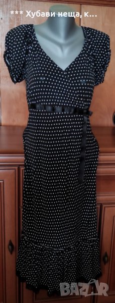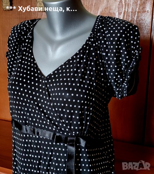 Черна рокля на бели точки. 🍀 Подходяща и за бременни дами 🍀Цена 24 лв. Роклята е чудесна за летните горещини. Красиво е декорирана със сатенена лента под бюста и с волан на полата. Материята е стегнато трико с еластичност. Мека, лека, пере се без гладене, съхне бързо. Стои красиво и придава ефирност и уникалност с раздвижената долна част. Моделът е такъв че прикрива някои несъвършенства на фигурата. Изработката е качествена. Почти нова е защото е обличана броени пъти. Цената е максимално занижена.