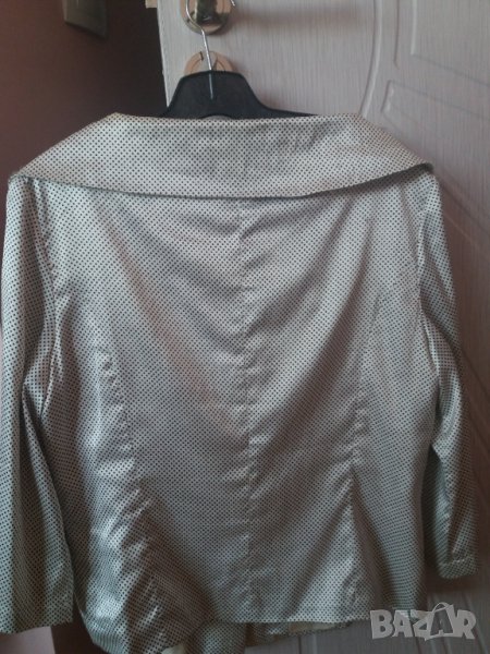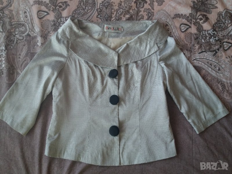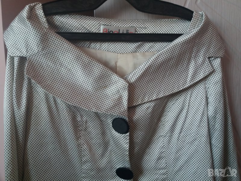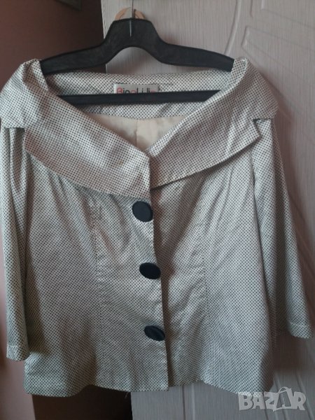 Дамски летен жакет с тънка подплата, с интересна по-голяма яка покриваща раменете, средно дълъг ръкав, с големи черни облечени копчета, цвят бял на черни точки, материята е много тънка лек, сатенено копринен, размер 42, М-Л, рамене 40 см, гърди 48 см отпред /96 см/, талия 44 см /88 см, дължина на жакета 51-2 см. ръкав 40 см