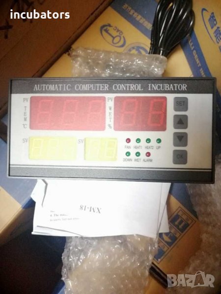 Пълен компютърен контрол за инкубатор. 220 волта, два изхода за нагреватели по 1500 вата. Голям дисплей, лесна настройка. На долния ред показва зададената температура и влажност, на горния ред реалната температура и влажност в инкубатора. Контрол на температура точност 0.1С градус, контрол влажност 1%. Превъртане на ляво, превъртане на дясно. Охлаждане при висока температура над две десети от настроената. Вентилация, проветряване на инкубатора през определено време. Аларма при висока или ниска температура, висока или ниска влажност.Мултифункционален цифров термостат за инкубатор яйца Xm-18