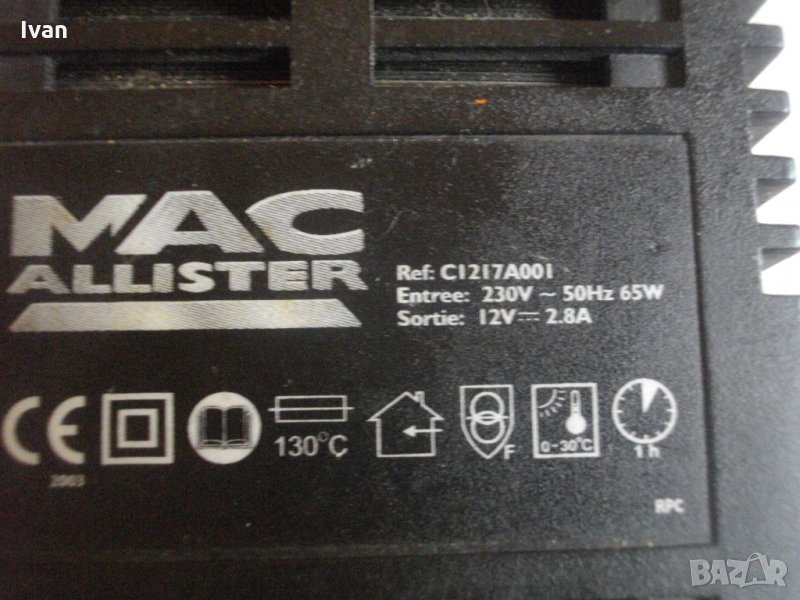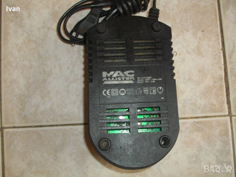 Описание на 12 волтово зарядно - Голямо и масивно зарядно 12 волтово,модел на Макалистер.Оригинално производство.Марка и модел-Mac Alister C1217A001.Зярядното е в отлично техническо състояние-работи много добре.Тежко и колоритно,с термозащита.Характеристики-12 волта,65 вата,2,8 ампера,2 светлинни индикации-зелена,червена.Корпус-твърдосплавна трудно запалима бакелитова пластмаса.