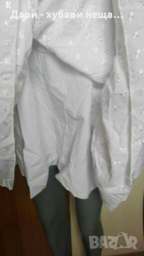 Страхотен снежно бял гащеризон - рокля (предлага се и в розов цвят).Интересен модел от памучна рязана дантела!Стои кокетно встрани, а панталонките не позволяват триенето при бедрата.Подходящ е и за бременни. Без еластичност, подходящ е за дами, носещи М/L, или L р-р .