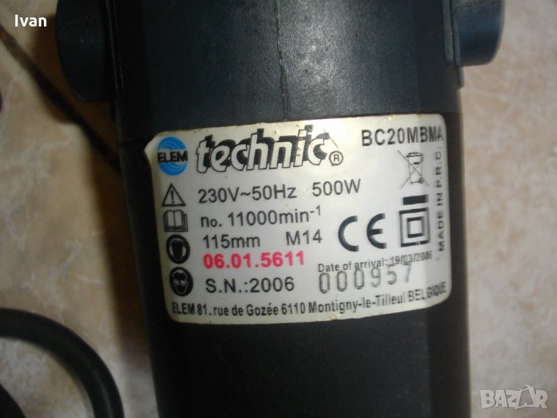Technic. Марка и модел на машината -Technic BC20MBMA. Лиценз за производство - Belgique, производство 2006 г., базирано в P.R.C. Машината е с много запазен външен вид и отлично техн.състояние. Няма никакво искрене на ниво четки, ротор, статор. Работи много добре - без забележки. Мощност на мотора - 500 вата, обороти - 11 000/минута. За дискове стандарт 115мм /125 мм. Гайка, шайба подложна за притягане - размер М14.Четки-външни. Налична оригинална странична дръжка. Пусков страничен ключ с приплъзване. На машината има поставен оригинален немски диск за полиране - съвсев нов. Ъглошлайфа е с оригинален предпазител на диска.
