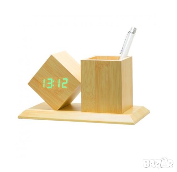 Часовника заедно с отделението за моливи е поставен на стойка с размери: 19 х 10 см.