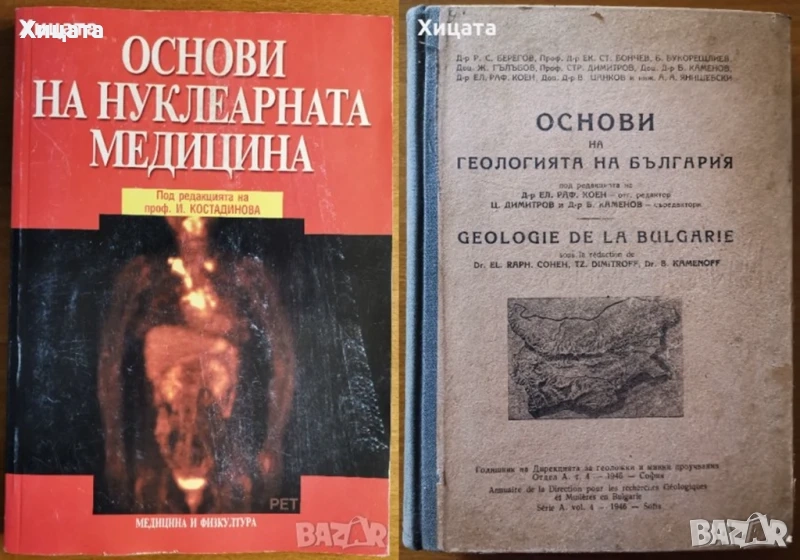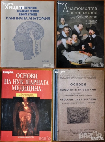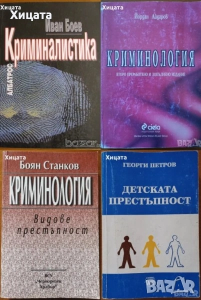 Криминология,Йордан Айдаров,Сиела,1998г.408стр.- 150лв. Криминалистика,Иван Боев,Изд.Албатрос,2002г.370стр.Отлична! - 150лв. Детската престъпност.Теория,методика и практика на превантивната дейност с малолетните и непълнолетните правонарушители,Георги Петров,Абагар,1998г.584стр. - 110лв. Криминология:Видове престъпност,Боян Станков, ВСУ "Черноризец Храбър",2003г.476стр.Отлична! - 150лв.Клинична анатомия,Христо Чучков,Владимир Овчаров,Никола Стойнов,Roshe,1995г.484стр. - 300лв Основи на нуклеарната медицина,Колектив под редакцията на проф. И. Костадинова,Медицина и физкултура,2006г.256стр.Отлична с леки забележки по корицата!! - 120лв Основи на геологията в България,Печатница С. М. Стайков,1946г.448стр.Изключително запазена! - 140лв Подвързани заедно : 1. Минералогия и познания по геологията.Част Първа,Русе Скоро-печатница Св.Кириллъ и Методий,1892г.100стр. 2. Учебникъ по Зоологията,Част Първа,Книжка Първа,Превел и издал З.Бояджиевъ,Скоро-печатница на Пано Ивановъ,Търново,1892г.126стр. 3. Учебникъ по Зоологията,Част Втора,Книжка 1-2,Превел и издал З.Бояджиевъ,Печатница на Йованъ Н.Вернай,Виена,1885г.186стр.(106стр.+ 80стр.) 4. Учебникъ по Ботаниката ,Съставили Ив.Мавровъ и В.Богдановъ,СливенъКнижарница