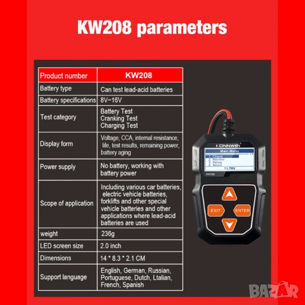 Измерва напрежение, съпротивление, анализ на състоянието на батерията; състояние на пулсации и на системата за зареждане, съхранение на данни.