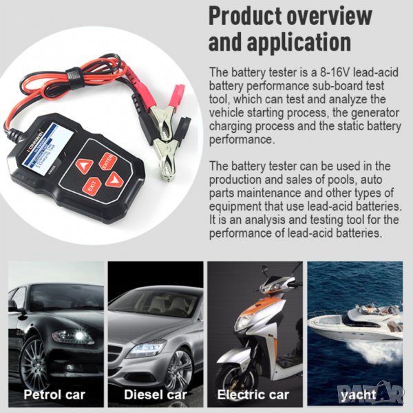 9. използва се за тестване на широка гама от 12V батерии (стартиращи [SLI], дълбоко циклирани и морски)