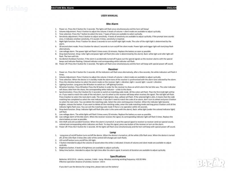Приемникът е оборудван с маркова каишка за китка. Работен обхват на приемника: до 150 метра. На предния панел на приемника има светодиодни индикатори за ухапване от брега, съответстващи на всяко от сигналните устройства, а под тях има бели светодиоди, сигнализиращи за ухапване до брега. Има и 3 бутона за регулиране на звука, тоналността, настройка на режимите „вибрация“, „тих“, „синхронизация“ и др. са предоставени.