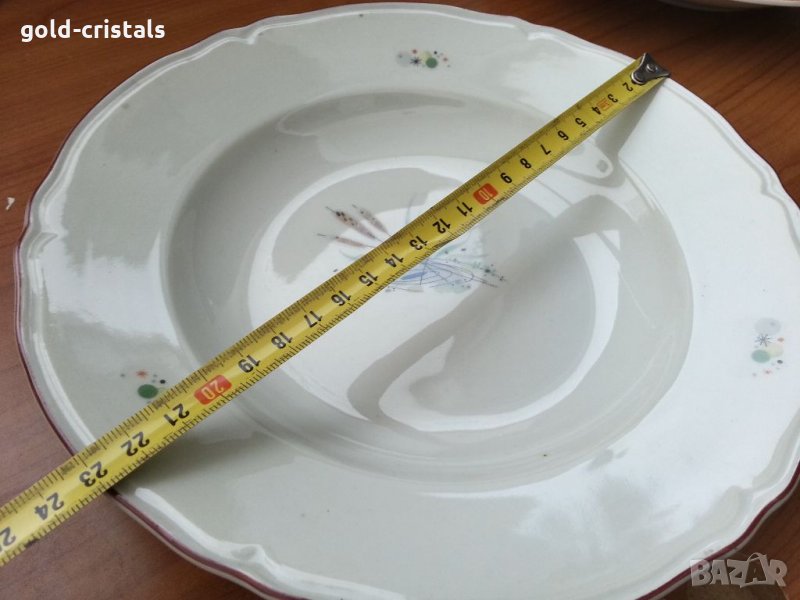 Стар български порцелан чинии дълбоки 6бр-35лв плитки за основно 6бр-45лв супник 50лв сосиера 25лв голямо плато 3бр -25лв за брой за брой има и малки елипси 6бр-60лв всичко е неизползвано без забележки сервиз комплект сет лот ретро арт декор винтидж колекция стари старинни антикварни предмети обзавеждане за дома и семейството подходящи за подарък за ценители и колекционери