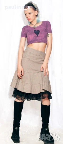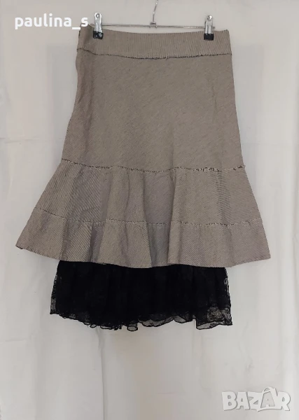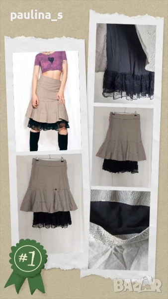 3️⃣. Колаж / XS / M - "S'nob". Цената е крайна 24,99лв / 12,4 евро. Дънкова пола с дантела и изнищени краища, накъсани и с дантелен волан. Моделът е с веревна талия, закопчаването е в страни със скрит цип. Десенът "нюд" / nude с дискретни черни райета. След ханша полата е с веревен волан, под който се продължава от хастара богато надиплен дантелен волан. Дрехата е уникат. Парчетата са свързани без подгъви - накъсан ефект, към оригиналния модел. Отпред горния волан е фиксиран набрано с допълнително метално копче с блестящи черни камъни.