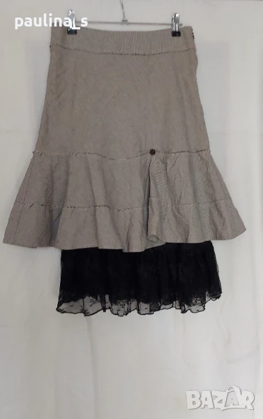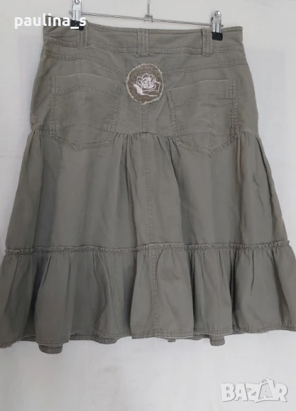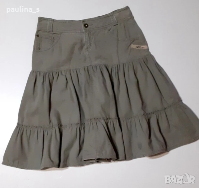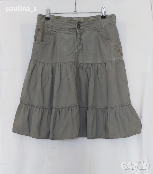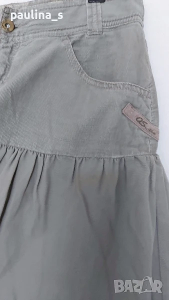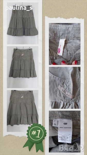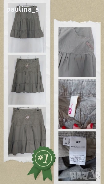 2️⃣. Колаж / S / M - QS by "S'Oliver". Цената е крайна 19,99лв / 9,8 евро. Памучна пола, много сполучлива комбинация между джинсово кадифе в горната част и дънков плат на воланите. Моделът отгоре е като дънки "5 pocket denim", а от нивото на ханша се разкроява за сметка на 2 волана. Цветът е Шам фастък и подхожда на всичко!