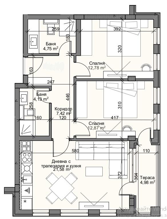 Жилището се намира на трети етаж и е с площ от 102 кв.м. Имота има следното разпределение: