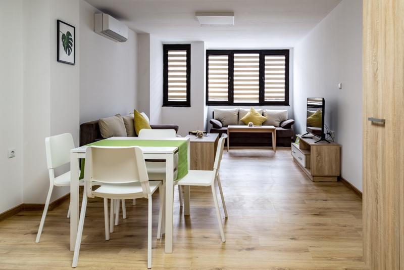 ежеседмично почистване, ежеседмична смяна на спално бельо и кърпи, телевизия + високоскоростен интернет, ток и вода.