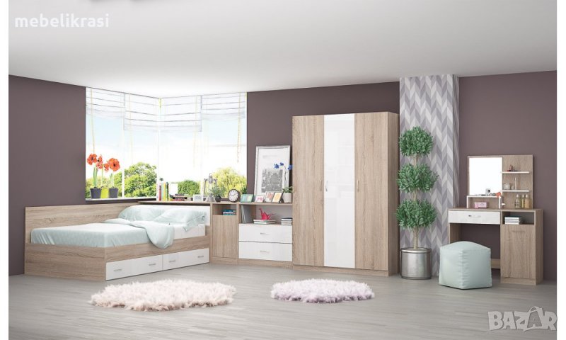 Спален комплект Андреа представлява комплект, който притежава всичко необходимо за обзавеждането на Вашата стая. Комплектът включва: легло с чекмеджета, ракла с предно отваряне, гардероб с рафтове и лост за дрехи и шкаф. За допълнително удобство вратичките са оборудвани с механизъм за плавно затваряне. Моделът е изработен от висококачествено ПДЧ 16 мм. Екстри: