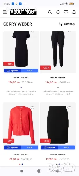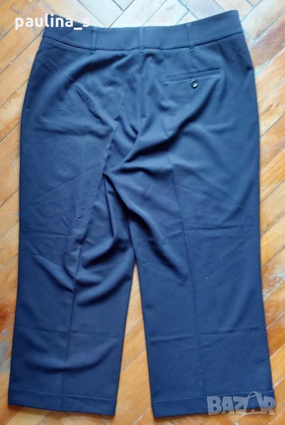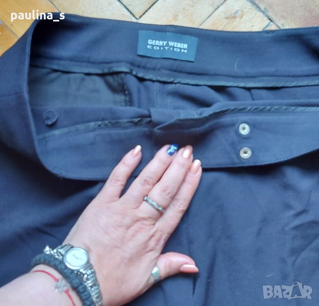 1. XL / 2XL - "Gerry Weber". Цената е крайна 34,99лв. Марков еластичен панталон с препокриващ колан, широки крачоли с маншети. Моделът е с прави крачоли, стоят свободно, широко. Цветът е тъмно син - navy blue. Материята е плътна и еластична, покрива няколко размера, една бройка е, без дефекти и етикет. Подходящ са за хладно време. Без дефекти. Прилагам и скрийншот за сверяване на цените на бранда.