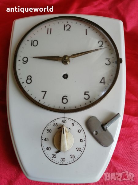 Уникален Рядък Стар Немски Керамичен Кухненски Механичен Часовник с механичен Таймер до 60 мин , Период на прозводство 1950/60г.Навива се с ключе.Работят Часовника и Таймера.Състоянието е видно.