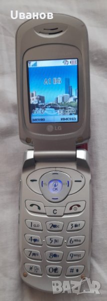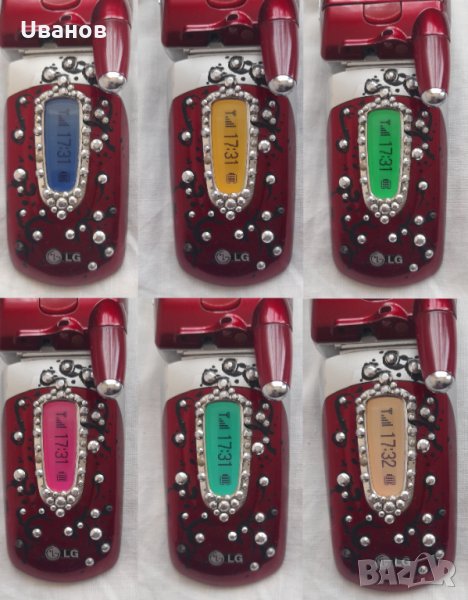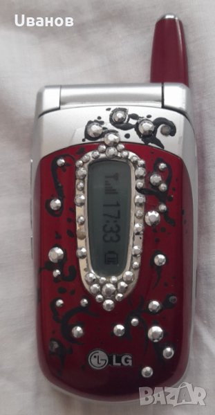 Мобилен телефон LG G5400, с два дисплея, ръчно изрисуван и облепен с изкуствени камъчета преден панел, сравнително запазен за годините си. Комплекта включва: телефона, LG слушалка/ хендсфрии, LG зарядно устройство, LG DataKit кабел за връзка с компютър, диск LG Entertainment Pack with Data Tool Kit, инструкция за употреба на български език, оригиналната му кутия за пренос/ съхранение. Основни параметри:
