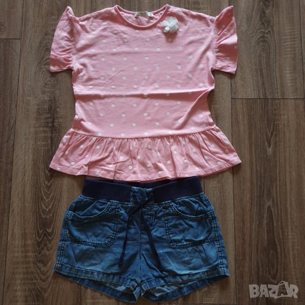 5. Розова туника на точки на Terranova с падащи ръкави и къси дънкови панталонки на звездички. Размер 128-134. Цена 7 лв.