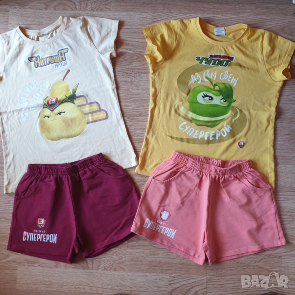 2. Две сетчета, състоящи се от 2 бр. къси панталонки и 2 блузки от серията с плодчета на Кауфланд. Сетчето с Хитруша Круша е размер 122-128, а това с Ябълката Чудо е размер 134-140. Цената за 1 сет блузка и панталонки е 6 лв. Двата сета за 10 лв.