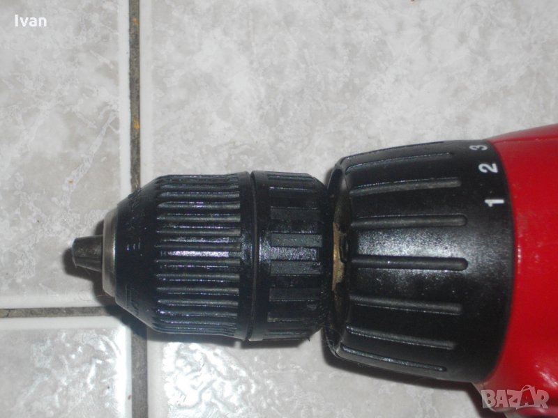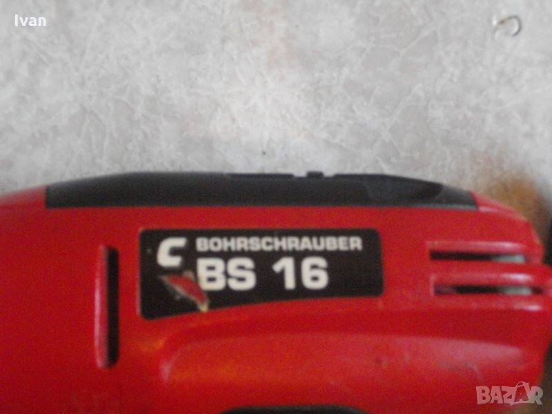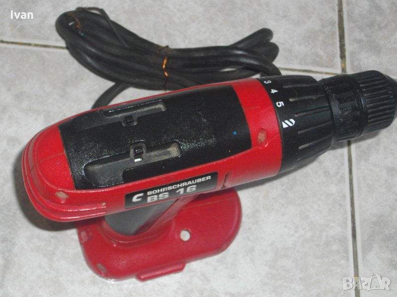 от автомобилен акумулатор 12 волта. Машината е немско производство. Марка и модел - Bohrschrauber BS 16. Запазен външен вид и техническо състояние - отлично. Работи много добре - силно, мощно, бързо и ефективно при работа.Степени на натягане - 5, отделно функция пробиване. патронник - самонатягащ до 10 мм захват.Две вградени горни места за накрайници - битове. Кабел - гумиран, двужилен, дължина 160 см. Цвят на бодито - червен.