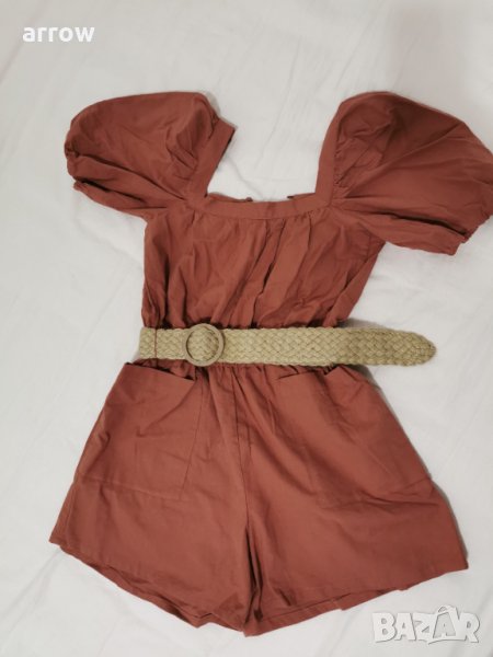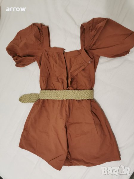 Къс гащеризон от тъкан памук със сплетен колан. С квадратно деколте и отвор с копчета отзад на врата. С къси обемни буфан ръкави с тесни ластици в краищата, шев с широк ластик на талията и външни предни джобове.