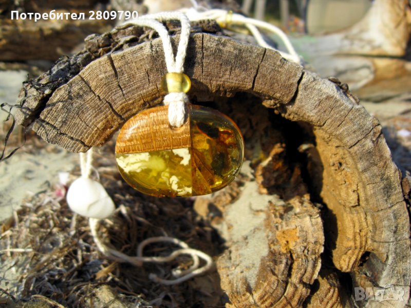 Оригиналната висулка се състои от 2 парчета естествен балтийски кехлибар и дърво, комбинирани в мозаечен стил. Тази висулка е на стилен декоративен шнур и украсена с прозрачно кехлибарено мънисто. Една естествена бяла черупка от българското Черно море служи като закопчалка. Ръчно изработен, единствен по рода си.
