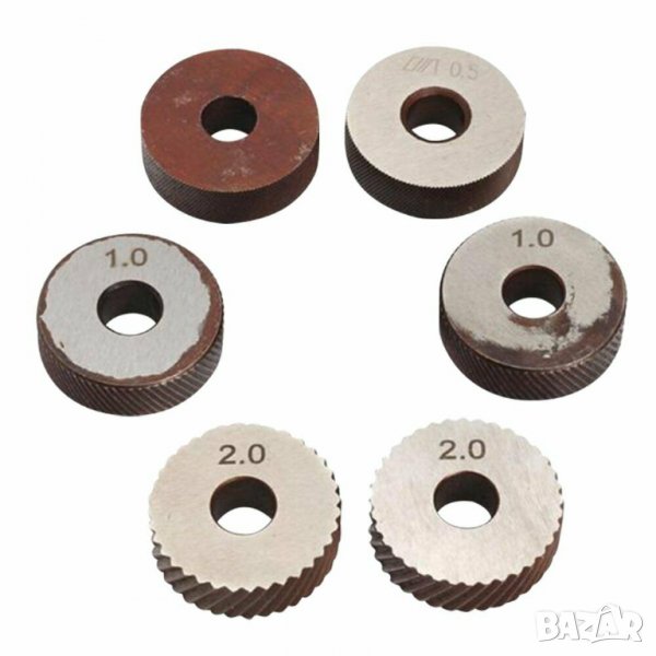 Инструменти за накатка на метал - комплект. 6 броя ролки със стъпки 0,5 мм., 1.00 мм. и 2.00 мм. в пластмасова кутийка. Размер на държача: 20 мм. * 18 мм.