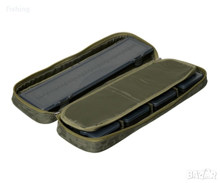 Carp Pro Tackle Bag CPLD66750 - полутвърд органайзер за шаранджийски Поводи и Аксесоари. Изработен от марка Oxford 650D с марка влагоустойчив камуфлажен материал. Има добре обмислен дизайн и се затваря с двупосочен цип. Основното отделение на Tackle Bag CPLD66750 е разделено от мека преграда на две отделения. В едното отделение в дълга пластмасова кутия има водач, в другото отделение има четири пластмасови кутии за 2, 3, 4 и 6 отделения за съхранение на малки аксесоари (куки, закопчалки, пръстени, вирбели и др.). Кутиите и водачът са прикрепени към чантата с велкро. Органайзерът Carp Pro Tackle Bag осигурява отлична защита на съдържанието благодарение на вложки от мек порест материал.