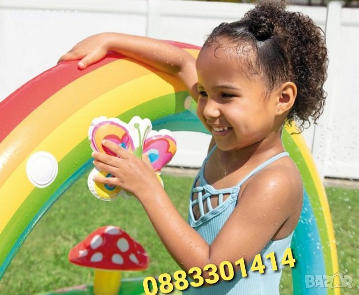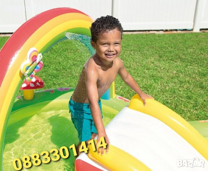 В долната част на пързалката има мека подложка за допълнително безопасно приземяване. За още по-голямо водно забавление можете да свържете градинския маркуч към басейна за игра, така че водата да се пръска от пръскачката в дъгата.
