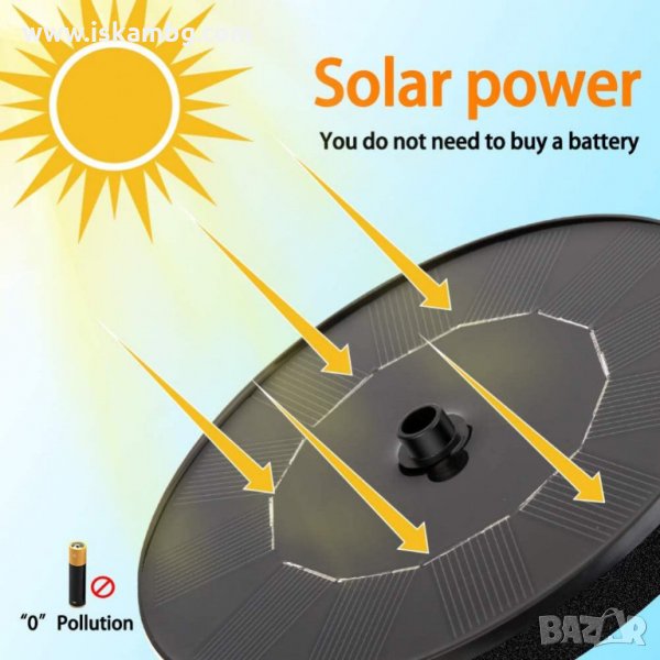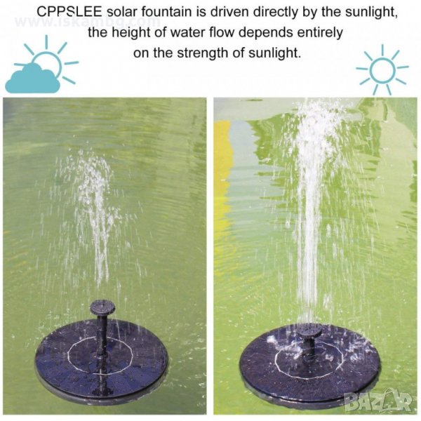 Соларният фонтан е снабден с 4 различни накрайника (разпръсквачи), чрез които можете да избирате каква точно да бъде формата на разпръскването на водата.Продуктът е съставена от кръгъл соларен панел с диаметър Ф160мм, а под него е залепена помпичка, която се захранва от него. При наличието на слънчеви лъчи, панела генерира моментно електричество и захранва помпичката. Върху помпичката се слагат накрайниците, които придават различната форма на струята. Соларният панел е изработен от лек материал, за да не потъва във водата, а помпичката под него изпомпва водата. Височината на струята варира между 30 - 60 см като се определя от яркостта на слънчевите лъчи и модела накрайник, който се използва.