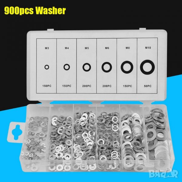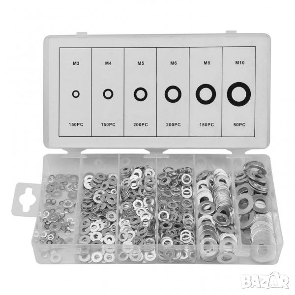 Комплекта се състои от 6 размера шайби, събрани в удобна пластмасова кутийка с разделители.