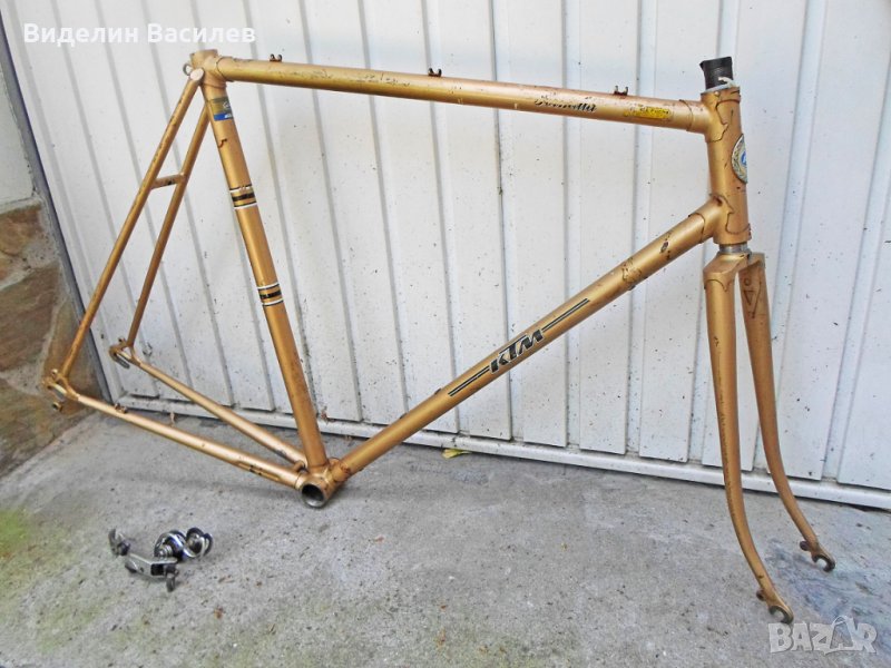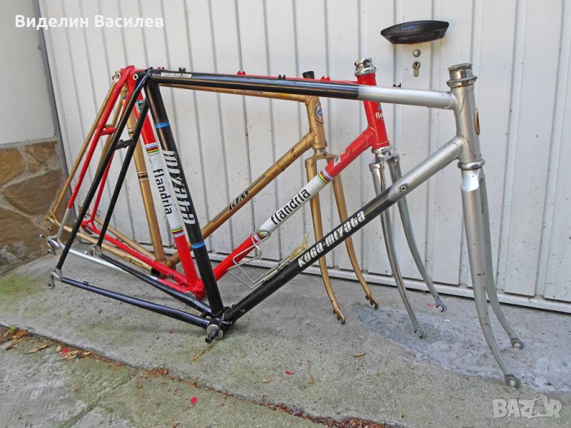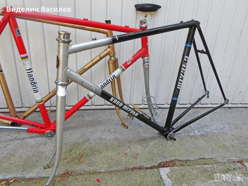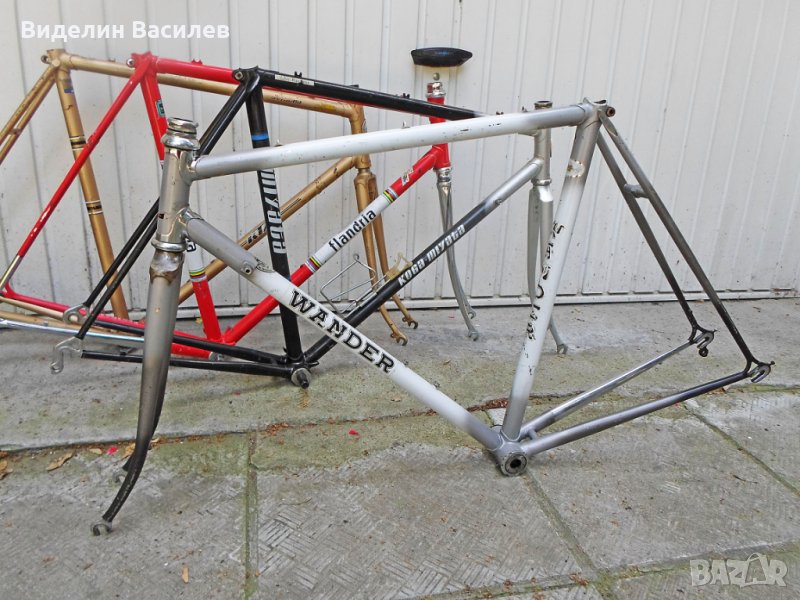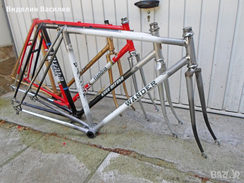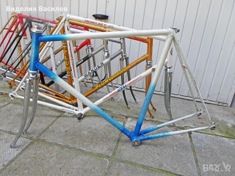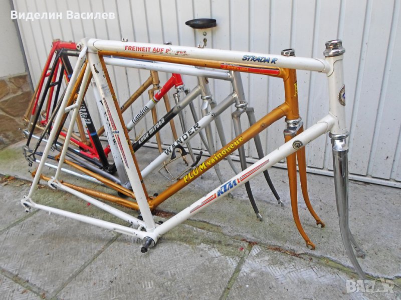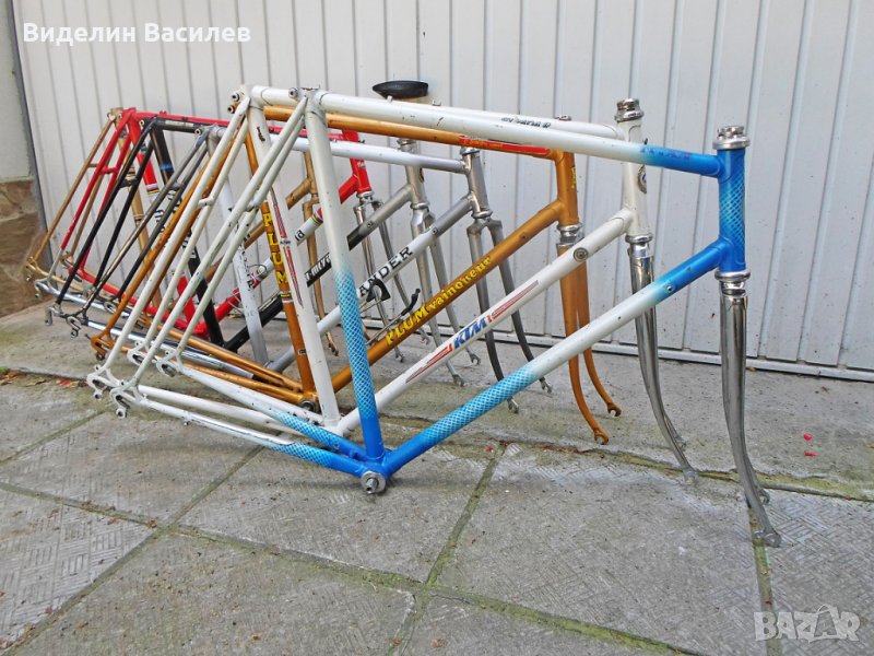 Рамки от ретро шосейни велосипеди в добро състояние/нормални козметични забележки/. С изключение на една, всички са с лагери средно/чашки вилка.Titan Exklusiv 59 размер/249 лв.KTM Strada R 60 размер,Columbus Aelle tubi/89 лв,вилката и чашките от снимките са продадени/.Plum Vainqueur 58 размер/249 лв/.Wander 53 размер/349 лв//Продадена//,Koga Miyata 56 размер/299 лв/.Flandria Competition 58 размер/199 лв/Ухото на задния дерайльор е изкривено, не знам дали може да се отремонтира успешно/мога да добавя дерайльор с ухо/.Цена без коментар/вилката е с уши Campagnolo ,Tange Levin чашки, средно Shimano,те струват толкова .KTM Formula S//Продадена/ . При интерес към някоя рамка пращам детайлни снимки !