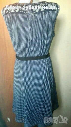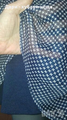 Изискана качествена и много лека рокличка!Тъмно синьо и бяло, на ситни фигурки.Подходяща е за повод, за офиса, или за подарък.