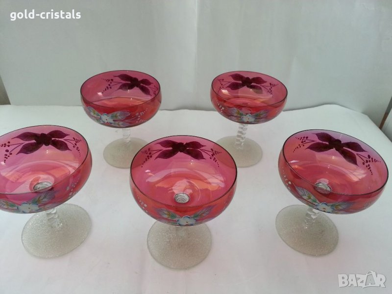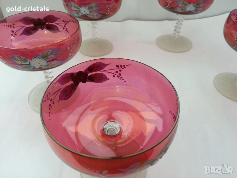 6 бр -590лв 4 бр-390лв Ретро стъклени чаши ръчно рисувани Бохемия на столче сервиз комплект сет лот ретро арт декор винтидж колекция стари за вино шампанско десерт сладолед мелби кремове декорация срещи маса празници гости трапезария подарък празник стъкло кристал дома кухнята стари антикварни предмети обзавеждане за дома и семейството подходящи за подарък за ценители и колекционери