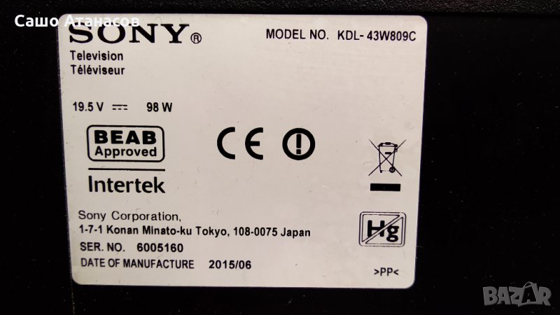 SONY KDL-43W809C със счупена матрица ,1-893-880-11 ,15STM6S-ABC01 REV:1.0 ,T550HVN08.2 ,1-894-388-11