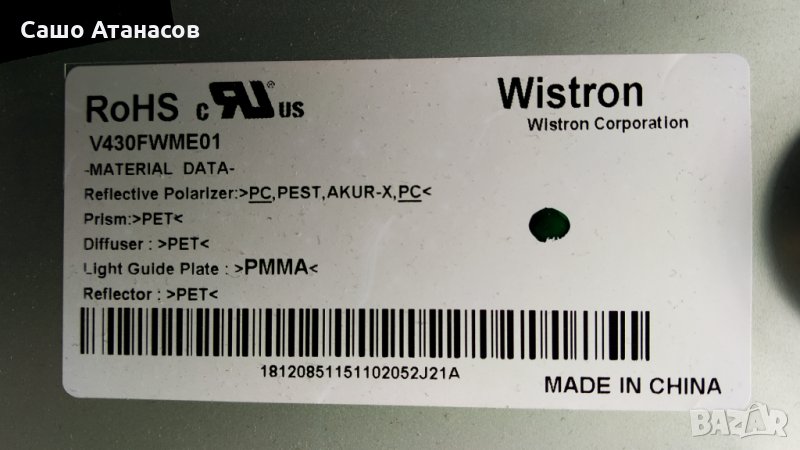 Модули от телевизор SONY KDL-43W809C със счупена матрица (панел V430FWME01 )