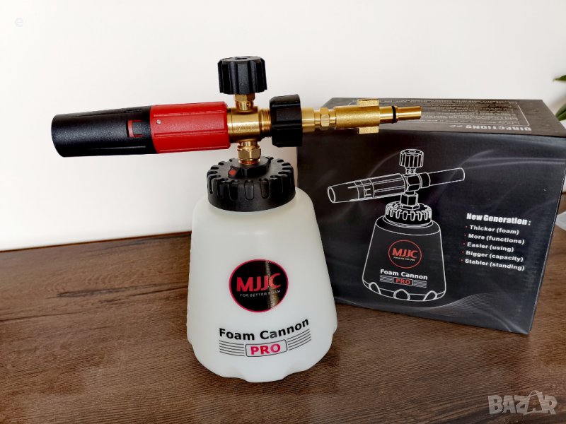 MJJC Pro - e ново поколение пянообразувател (Професионален) , изработен по нова технология на MJJC.Тази нова технология е по-здрава и създава повече, по-плътна пяна с по-малко препарат, дори и с по-малки барове водоструйки. Те имат по-добра система за свързване. Това им позволява лесно да се прикрепят към вашата водоструйка и прави смяната на приставките по-лесна и бърза.Просто казано, те са по-добри, по-здрави и ви спестяват препарат, като същевременно създават повече пяна, което улеснява и по-бързо разпенване на автомобила ви.