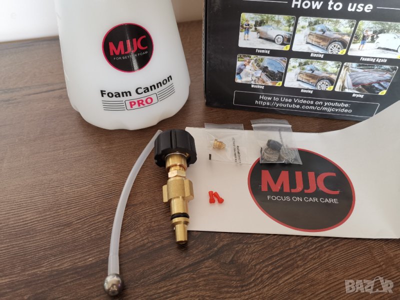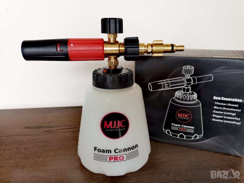 MJJC Pro - e ново поколение пянообразувател (Професионален) , изработен по нова технология на MJJC.Тази нова технология е по-здрава и създава повече, по-плътна пяна с по-малко препарат, дори и с по-малки барове водоструйки. Те имат по-добра система за свързване. Това им позволява лесно да се прикрепят към вашата водоструйка и прави смяната на приставките по-лесна и бърза.Просто казано, те са по-добри, по-здрави и ви спестяват препарат, като същевременно създават повече пяна, което улеснява и по-бързо разпенване на автомобила ви.