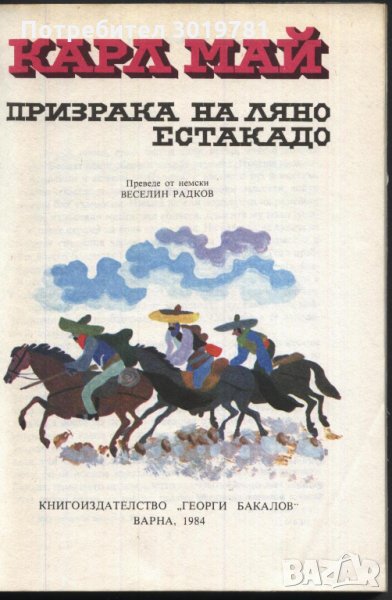 1. Заглавие: Призрака на Ляно Естакадо Автор: Карл Май корици: Меки, Обем: 226 стр. Издателство: "Георги Бакалов" Варна Година на издаване: 1984 Състояние: Добро 72 - 2 (сн. 1 и сн. 2)