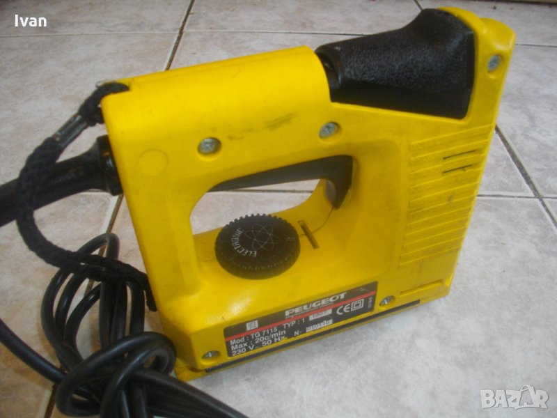 Отличен дърводелсдки професионален такел, с електронен контрол на скоростта, професионален френски оригинален модер на Пежо. Марка и модел на машината - PEUGEOT ELECTRONIC . Производство - оригинално френско 1997 г - FRANCE. Старото, висококачествено профи произвосдтво от едно времеу което в съвремието липсва. Такера е за дърводелски пирони 16 мм и кламери - скоби размер 14 мм. Много запазен външен вид и отлично техн. състояние. работи много добре. Удара е силен и мощевн. Електронен контрол на скоростта и ръчен 7 степени. макс 20 удара/мин. Корпус - бакелитова пластмаса. Автозащита на спусъка. Платова вързалка за удобно носене на ръката. Глава и пълнител - метални. Машината е заредена с дузина скоби - кламери за проба и тест в офис Еконт.