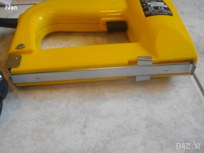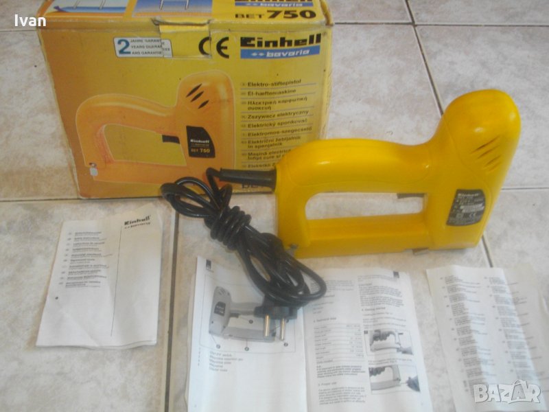 електрически такер дърводелбски за скоби-кламери и дърводелски пирони, размери 10-16 мм, немски модел на Ейнхел. Марка и модел на машината - Einhell BET 750. Производство - оригиналнонемско, старото и висококачествено - 2004 г. Машината е в отлично техн. състояние.- Удара е силен и мощен, забива добре докрай аксесоарите. За скоби и пирони размер от 10 до 16 мм. Скорост - 20 удара в минута. Стоманен пълнител със стоманена капачка. Към машината има книжки указания за употреба на небългарски езици.Такера е прибран в оригиналната си немска картонена опаковка.