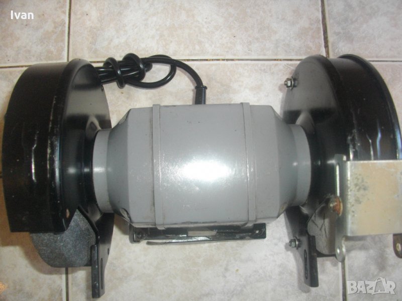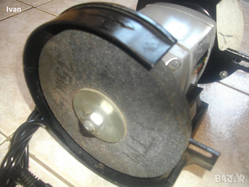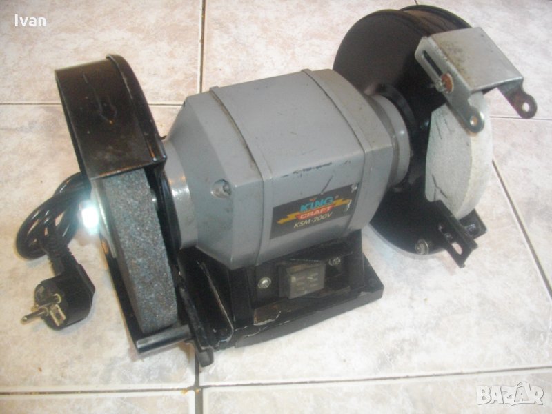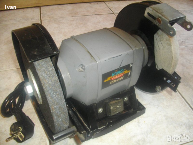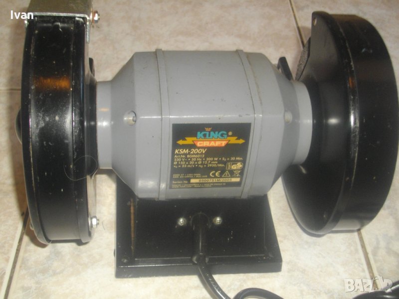 Шмиргела е със запазен външен вид и техн.състояние.- описаното по-горе. Марка и модел на машината - King Craft KSM-200V. Производство - 2005 г. - China. За камъни дискове размер голям ф 150 мм. Поставени два нови камъка на машината - сива абразивност и бял. Преден пусков ключ с антипрахово, силиконово покритие. Долна стойка - осново - алуминиева, която леко е пропукана от едната страна на единият ъгъл /показвам на последната снимка мястото на пропукването/, но машината стой стабилно и здраво изправена. корпус - стоманен. По машината няма пластмаса, с изключение на пусковият ключ. Тегло - около 5,0 кг.