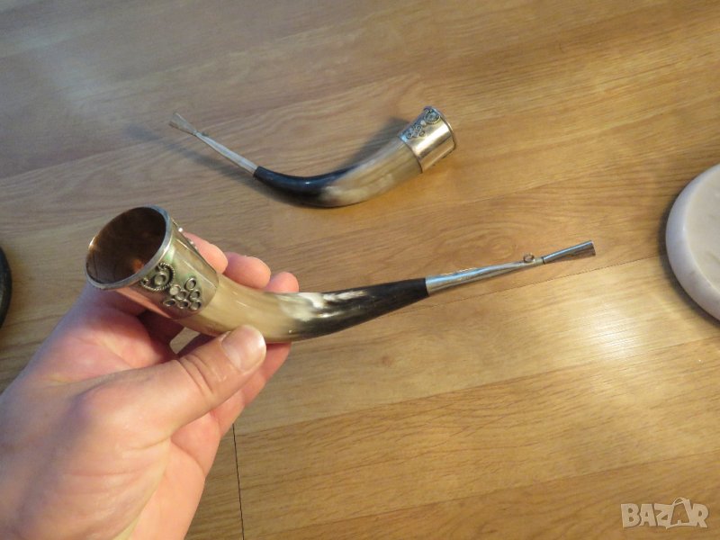 Комплект два старинни рога с бронзов обков подходящи за пиене на вино, медовина или декорация .