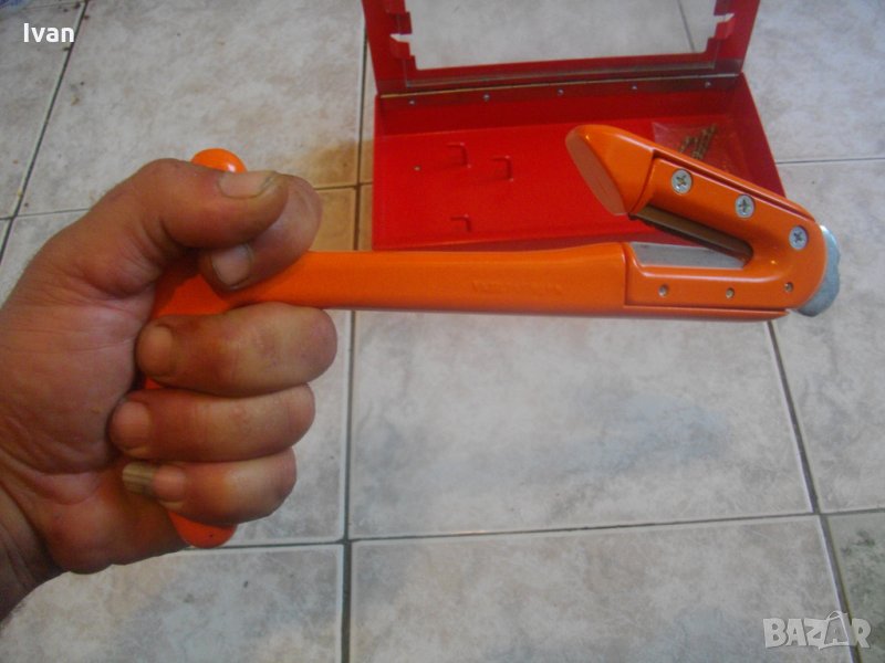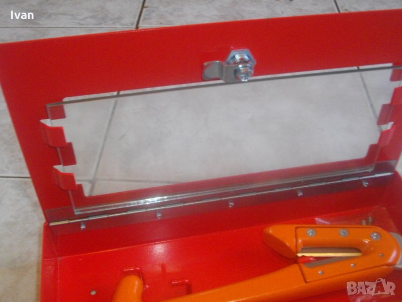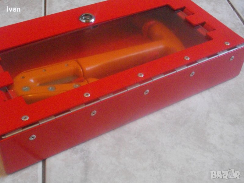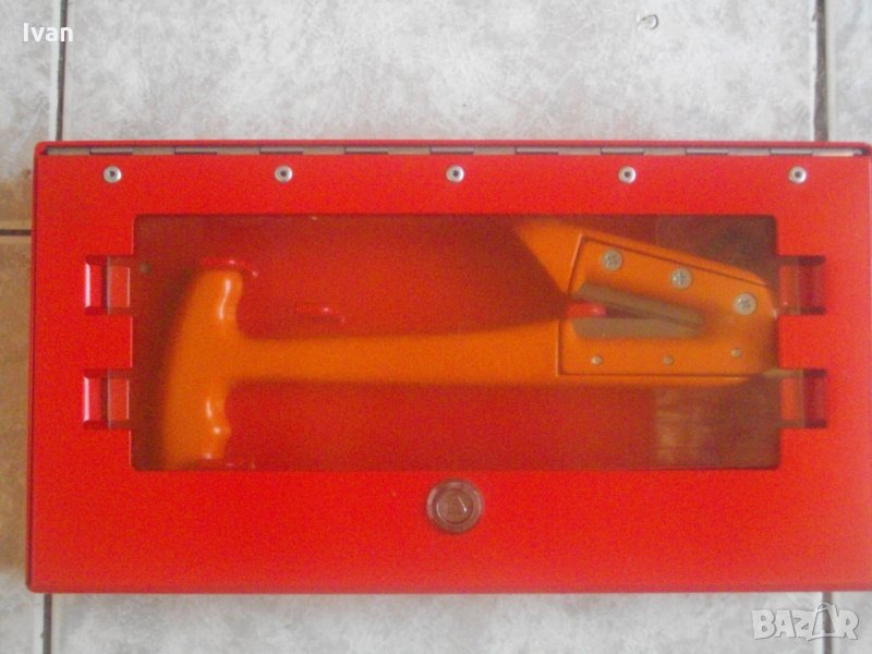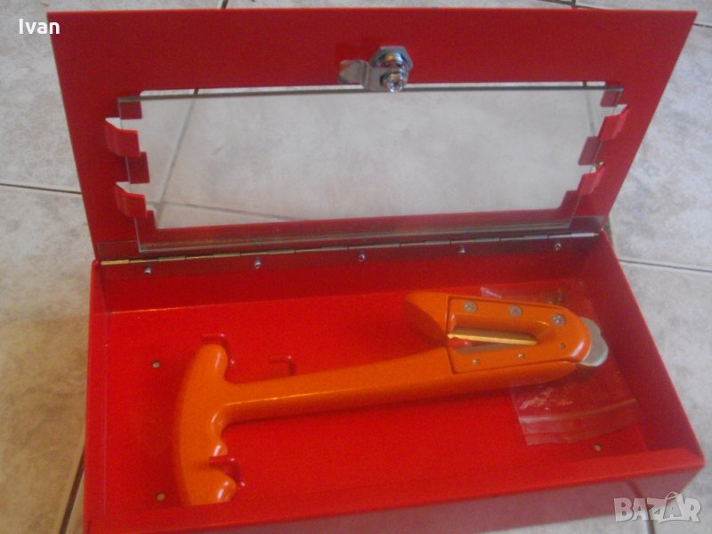 Съвсем ново и неизползвано масивно стоманено, удобно чукче тип аварийно за счупване на стъкла при аварии на автомобили/автобуси и прерязване на предпазни колани за лесно излизане на пътниците. Инструмента е луксозно, здраво, масивно и качествено изпълнение. В метална масивна кутия с отваряем капак и дебело стъкло за лице на кутията, с масивни панти и възможност за захват на кутията , чрез направени 4 дупки на долната й страна. Чукчето е с дължина общо 245мм, ширина дръжка за захват на пръстите на ръката при използване - 110 мм. Два много остри големи режещи ножове от закалена стомана за рязане на предпазните колани, с дължина по 50 мм и заострен наклон на остриетата 5 мм. Чукчето отпред е със стоманен заоблен връх закален с ширина 35 мм за чупене на стъкло при авария. Производство на чукчето - надпис Made in China. Ножовете са сменяеми - с по 3 винта е захвата. Тегло на инструмента - около 600 гр. Чукчето е прибрано в оригиналната си масивна стоманена кутия аварийна , която има възможност за закрепване . Налични са видии за захват. Кутията е с ключалка метална за триъгълен стандартен ключ, които не е наличен. Ключалката е отворена, Капака стой затворен добре и без да е заключен. Тегло на кутията - над 1 кг.