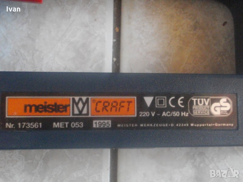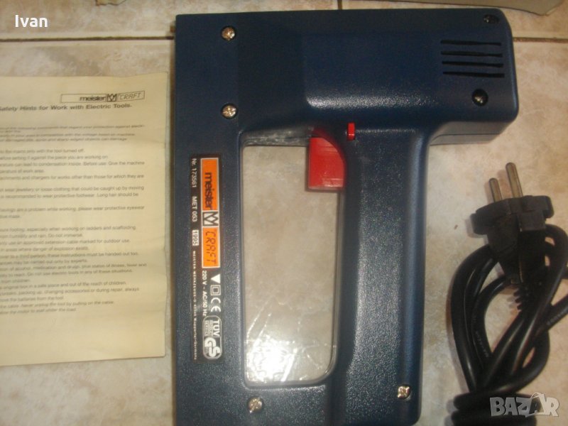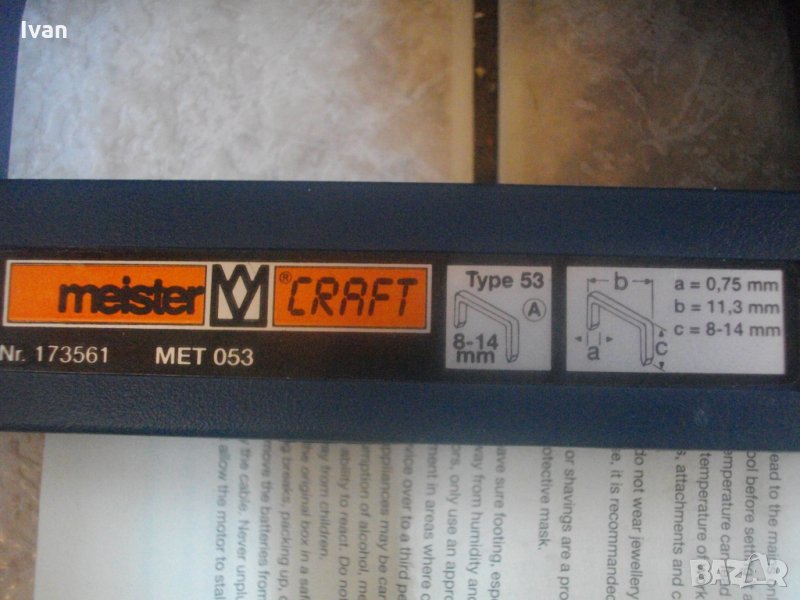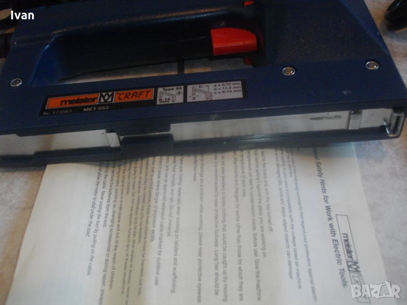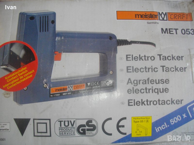 такер, с капацитет на аксесоарите скоби и дърводелски пирони - 8-14 мм, професионален модел на Мейстер. Такера е от старото висококачествено немско здраво и надеждно производство, котео днес липсва в производство. Марка и модел на машината - Meister Craft MET 053. Единият такер е производство 1995 г, другият - 1998 г. Производство - оригинално Германия - упоменато на маркировките. Такера е в пълна и отлична техн. изправност. силен и мощен удар и забиване на аксесоар изцяло до дъно. Пълнител- метален стоманен изцяло. Книжка указания за употреба на небългарски езици. Поставени аксесоари към машината за проба и тест в офис Еконт, и отделно още малко в оригинална на марката кутия. Функция заключване на спусъка. Машината е прибрана в оригинлната си немска картонена опаковка.