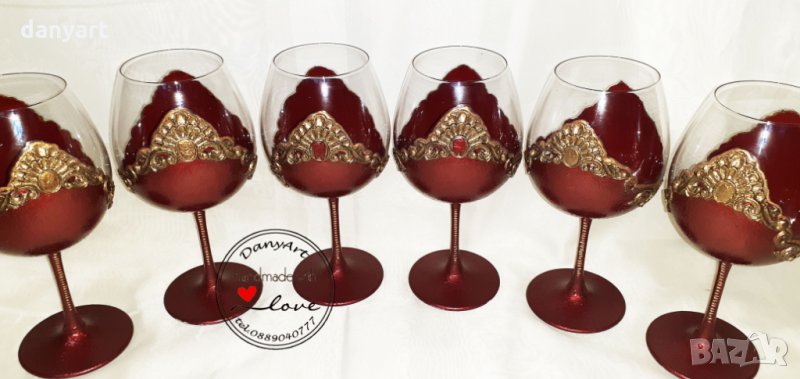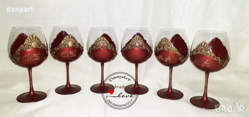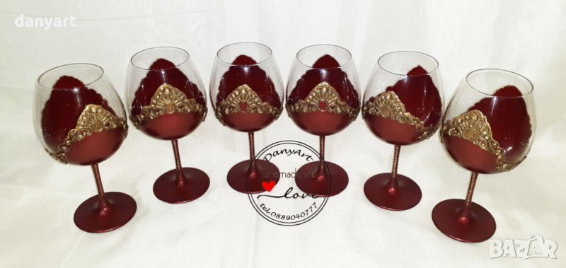 6 бр. чаши за червено вино "Bordo and Gold" ръчно декорирани,съчетание от античен златен цвят и бордо.Принесете нотка античен стил в дома си или подарете оригинален и стилен подарък на близък или приятел! Тройно лаково покритие което гарантира издръжливост на продукта!
