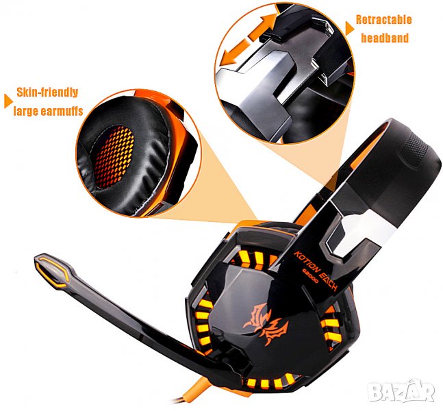 -Красива LED подсветка: Ярките LED светлини са проектирани върху слушалките и микрофона, подчертавайки атмосферата на играта. Великолепна изолация от околния шум.