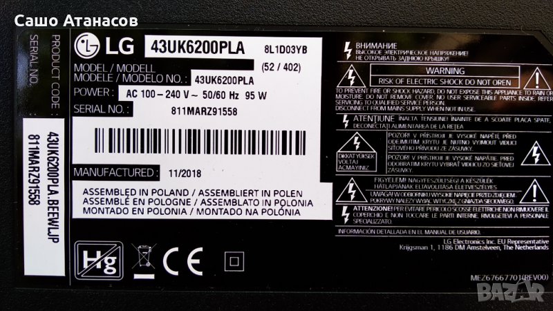 LG 43UK6200PLA със счупена матрица , LGP43DJ-17U1 ,EAX67872805(1.1) ,TWCM-K305D ,HC430DGG-SLWL1-A111