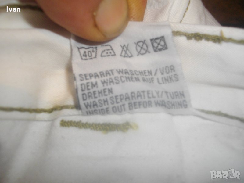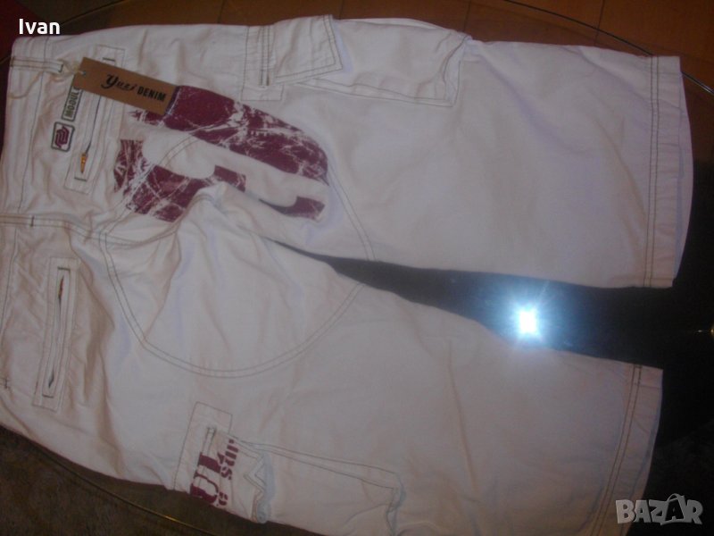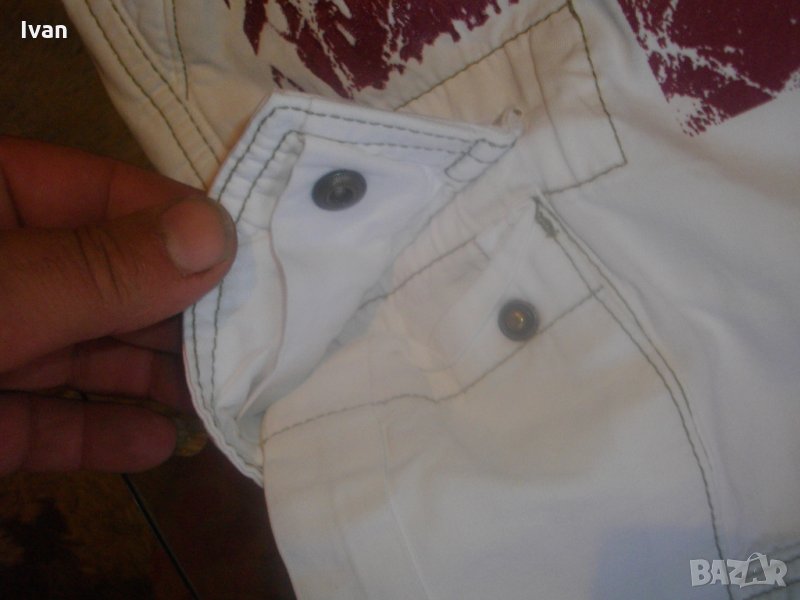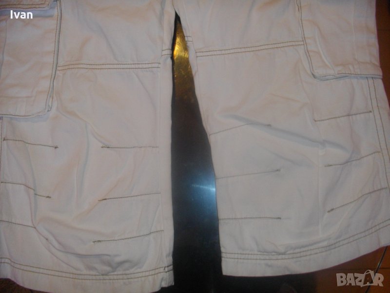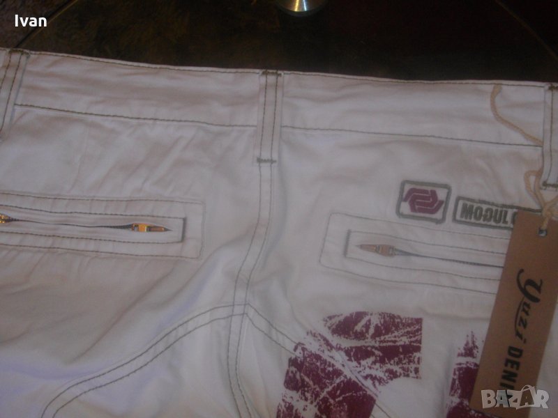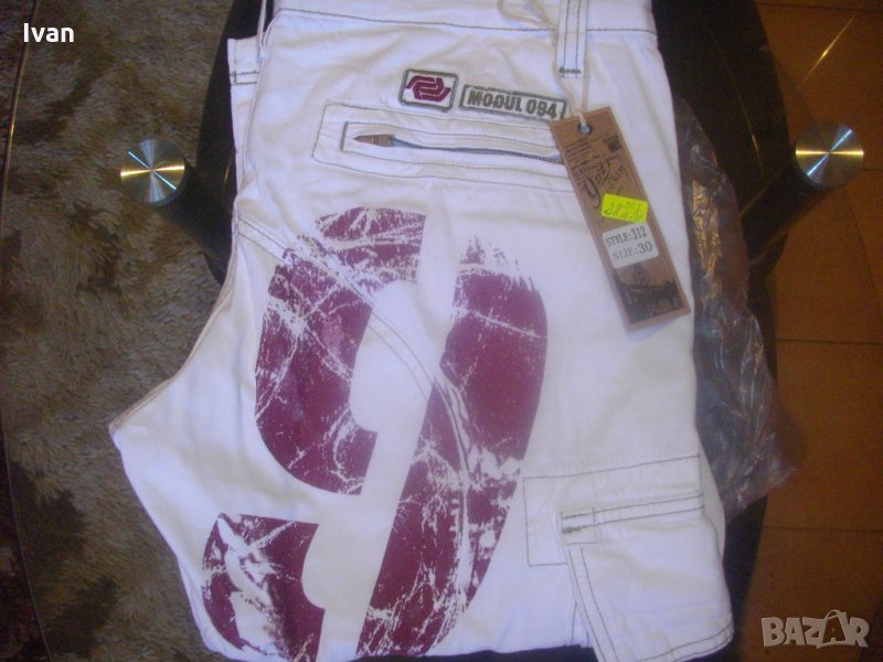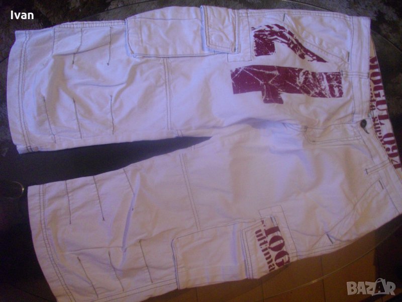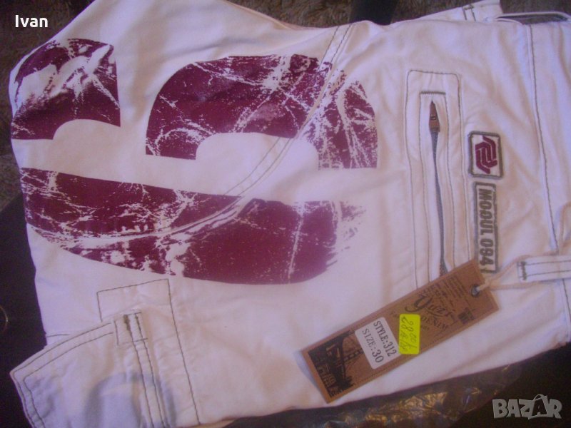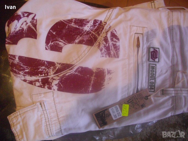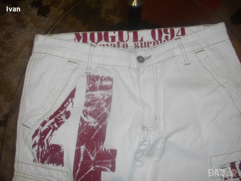 Съвсем нови спортни маркови мъжки 7/8 панталони, в бял цвят, тип дънкови. Марка - Mogul 094. Производство - Made in Turkey. По етикет №30, за мъж около 70 кг и височина 172-178 см. Два задни джобя с метални ципове. Два предни джоба, отделно два външни джоба с капаци и капси тик-так закопчаване на капака. Колан с гайки за външен колан. Метален цип, метално копче за закопчаване - оригинални на марката, с фабричното лого. Материал по етикет - 100 % памук. Пране - 40 градуса. Основен цвят - бял, с две малки щампи и една голяма в цвят вишнаво. Дължина от колана до края на крачол цялостна - 755мм, дължина от чатал на крачол - 510 мм, ширина на панталоните /обиколка на колана/ - 880 мм. Подплата на всички джобове - бяла памучна.