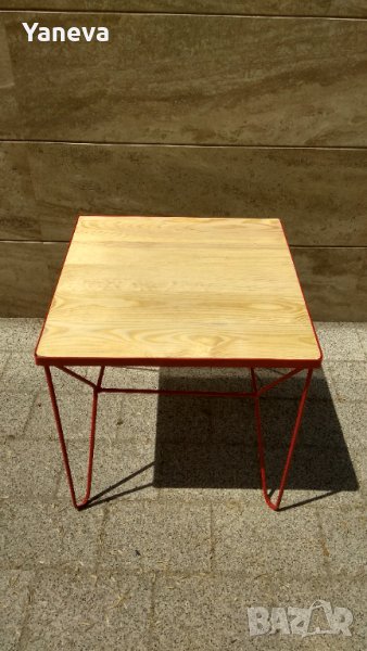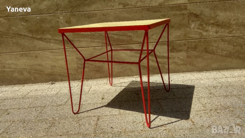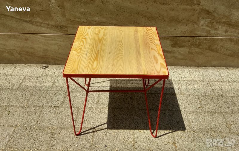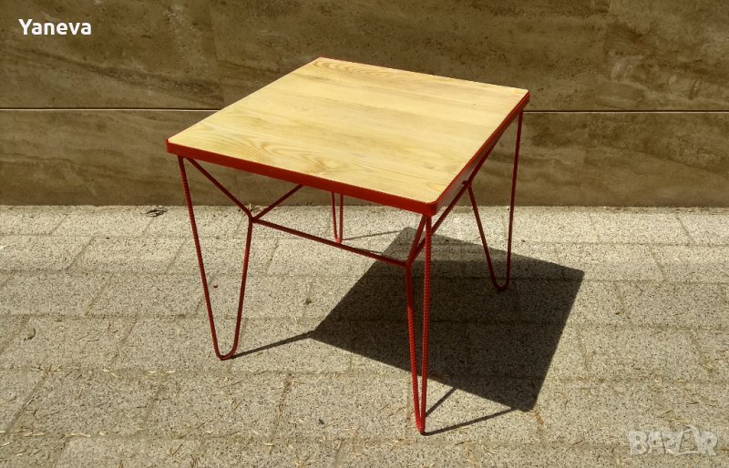 Маса индустриален дизайн, ковано желязо и дървен плот от чам.Размери 60/60/60.Цена 180 лв.
